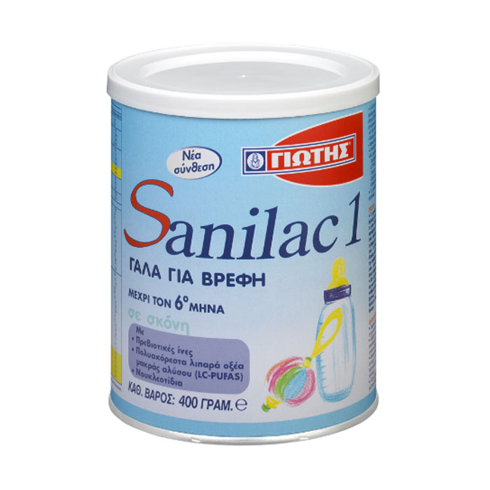 Το Sanilac 1 είναι Γάλα σε σκόνη για βρέφη μέχρι τον 6ο μήνα. Με πρεβιοτικές ίνες. Πολυακόρεστα λιπαρά οξέα μακράς αλύσου (LC - PVFA) . Νουκλεοτίδια.