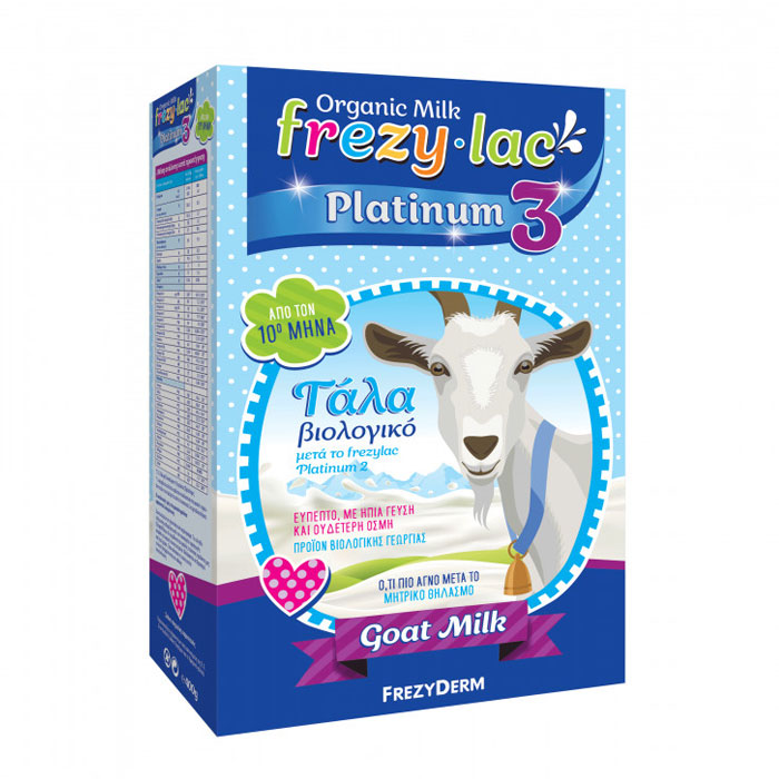 Frezylac Platinum 3 Αγνό βιολογικό κατσικίσιο γάλα σε σκόνη. Αποτελεί την ιδανική τροφή μετά τον θηλασμό για βρέφη από τον 6ο έως τον 12ο μήνα στο πλαίσιο μίας μεικτής διατροφής. Βασισμένο στις απ