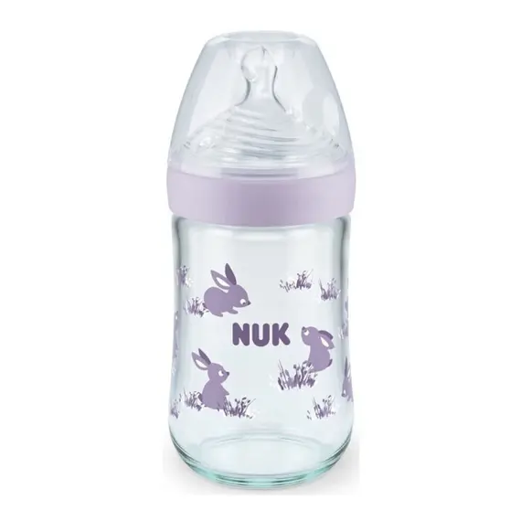 Nuk Γυάλινο Μπιμπερό Nature Sense με Θηλή Σιλικόνης 240ml για 0-6 μηνών Με θηλή από σιλικόνη, υλικό άοσμο, άγευστο και ανθεκτικό στη θερμοκρασία. Τα γυάλινα μπιμπερό είναι πιο εύκολα στον καθαρισμό
