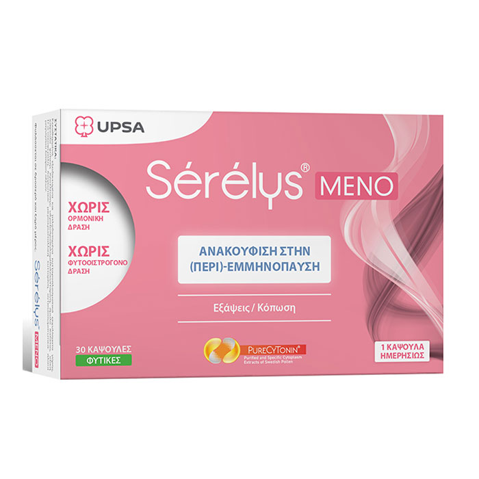 UPSA Serelys Meno Συμπλήρωμα για την Εμμηνόπαυση 30 φυτικές κάψουλες Συμπλήρωμα διατροφής για την ευεξία των γυναικών στην περιεμμηνόπαυση και εμμηνόπαυση. Το Serelys MENO είναι ένα προϊόν χωρίς ορμ