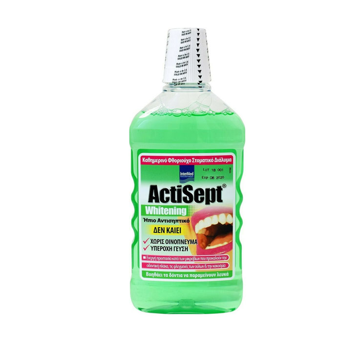 Intermed Actisept Whitening Στοματικό Διάλυμα για Λεύκανση 500ml Φθοριούχο καθημερινό στοματικό διάλυμα με ήπια αντισηπτική και λευκαντική δράση. Κατάλληλο για την καθημερινή φροντίδα και προστασία
