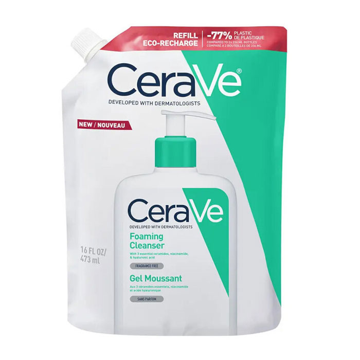 CeraVe Foaming Cleanser Refill Gel Καθαρισμού Προσώπου 473ml Αναζωογονητικό αφρώδες τζελ καθαρισμού για το κανονικό έως λιπαρό δέρμα. Καθαρίζει και απομακρύνει τη λιπαρότητα χωρίς να διαταράσσει τον