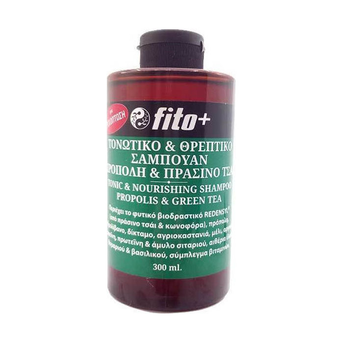 Τονωτικό και θρεπτικό σαμπουάν Fito+ με πρόπολη και πράσινο τσάι. Περιέχει το φυτικό βιοδραστικό REDENSYL® (από πράσινο τσάι & κωνοφόρα), πρόπολη, δενδρολίβανο, δίκταμο, αγριοκαστανιά, μέλι, αργινίνη