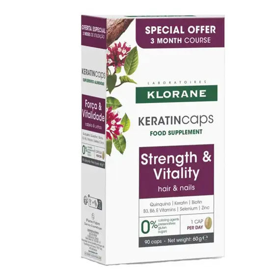 Klorane Strength & Vitality Ειδικό Συμπλήρωμα Διατροφής 90 κάψουλες Πλούσιο σε μικροθρεπτικά συστατικά και κερατίνη, το συμπλήρωμα διατροφής για μαλλιά και νύχια με κινίνη & κερατίνη δρα εκ των έσω δ