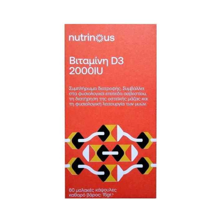 Συμπλήρωμα διατροφής Nutrinous Vitamin D3 2000iu 60 μαλακές κάψουλες Συμβάλλει στα φυσιολογικά επίπεδα ασβεστίου, τη διατήρηση της οστεικής μάζας και τη φυσιολογική λειτουργία των μυών.