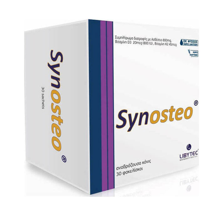 Συμπλήρωμα διατροφής Libytec Synosteo 30 φακελίσκοι με ευχάριστη γεύση πορτοκάλι που συνδυάζει τα πλεονεκτήματα της χορήγησης ασβεστίου, βιταμίνης D και βιταμίνης K2 σε μία μόνο λήψη ημερησίως. Η