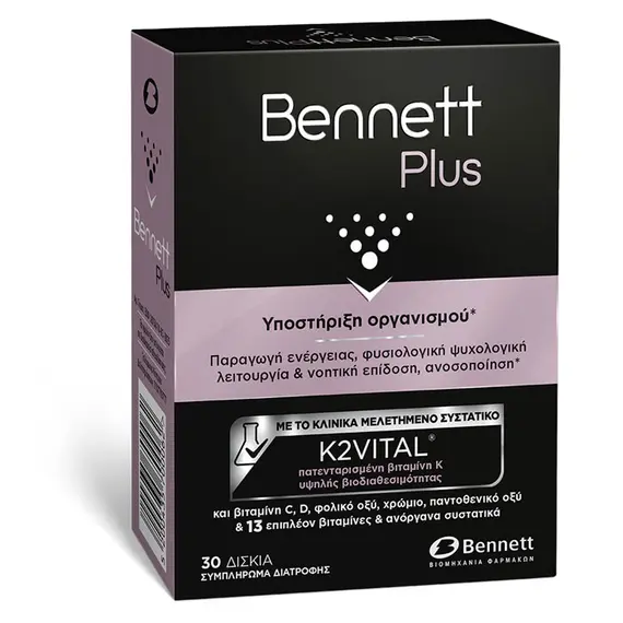 Bennett Plus 30tabs, Συμπλήρωμα Διατροφής Πολυβιταμινών & Μετάλλων για Ενέργεια, Καλή Διάθεση, Αυξημένες Νοητικές Επιδόσεις & Γερό Ανοσοποιητικό. Το Bennett Plus είναι ένα συμπλήρωμα διατροφής το οπο