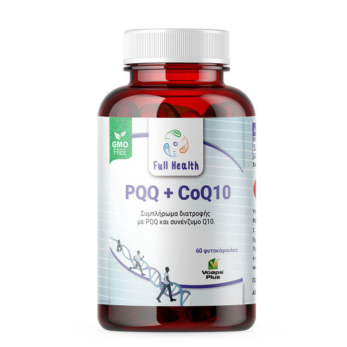 Συμπλήρωμα διατροφής Full Health PQQ + CoQ10 60 κάψουλες, με φυσική μορφή κινόνης πυρρολοκινολίνης (PQQ) και συνένζυμο Q10. Το διατροφικό συμπλήρωμα στοχεύει στην ενίσχυση της εγκεφαλικής λειτουργίας