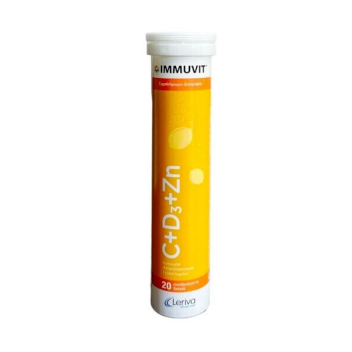 Leriva Immuvit C+D3+Zn Λεμόνι 20 αναβράζοντα δισκία Συμπλήρωμα διατροφής κατάλληλο για την τόνωση της φυσικής άμυνας του οργανισμού μέσω της ενίσχυσης του ανοσοποιητικού συστήματος και ενδείκνυται σε